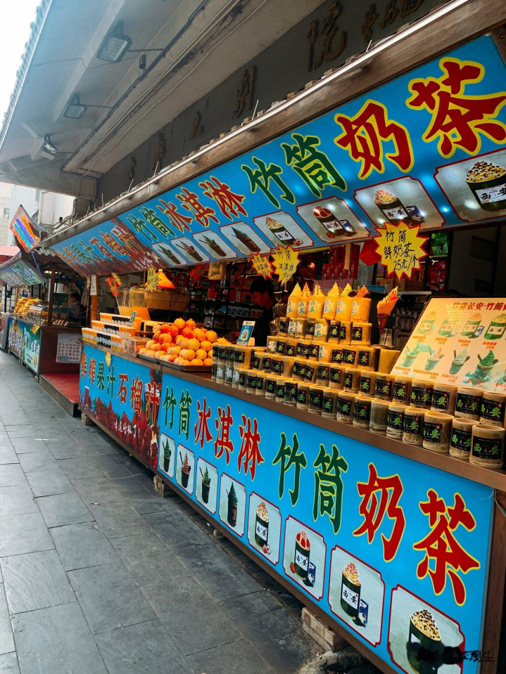 街边小店售卖同款竹筒奶茶、新疆羊肉串,墙上悬挂同款“我在XX很想你”标牌,就连播放的歌曲都高度雷同。
